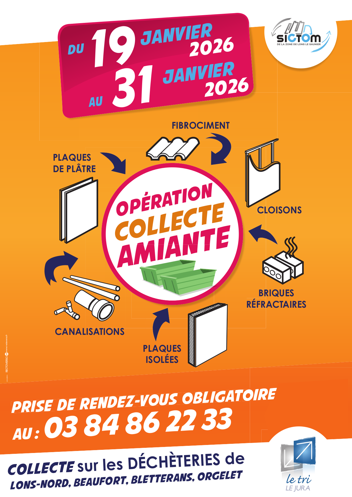 L’opération "Déstockage d’amiante" se déroulera du lundi 19 au samedi 31 janvier 2026, dans les déchetteries suivantes : Beaufort, Bletterans, Orgelet et Perrigny (Lons Nord).
